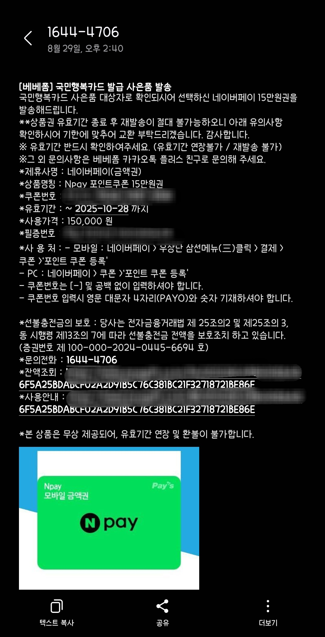 문자에는 쿠폰 번호와 등록 방법이 함께 안내되었고, 바로 포인트를 사용할 수 있었다.