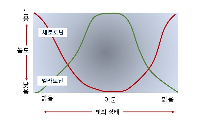 세로토닌은 낮 동안 활력을 주는 호르몬으로, 저녁이 되면 다시 멜라토닌으로 전환됩니다.