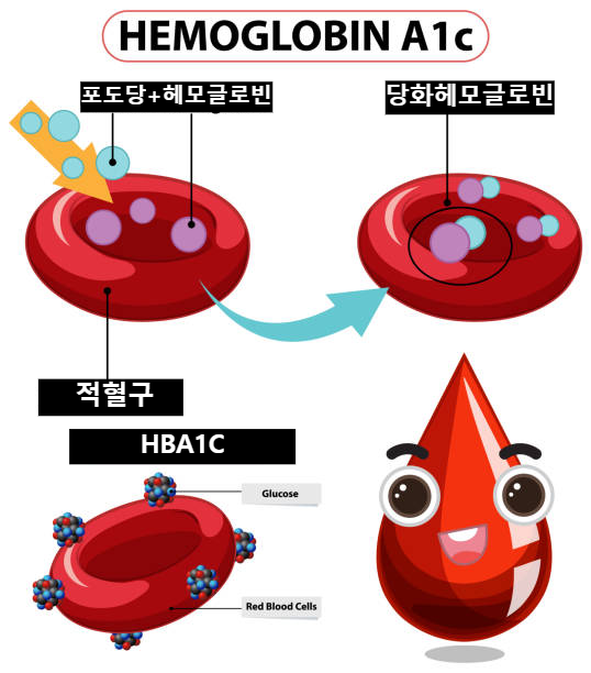 혈액 속 포도당은 적혈구 안의 헤모글로빈과 결합해 당화혈색소(HbA1c)를 만듭니다. 혈당이 높으면 이 혈색소가 증가하므로, 최근 3개월간 혈당 조절이 잘 되었는지를 판단하는 지표로 사용됩니다.